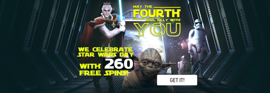 May the Fourth be with you! This time of the year has finally come. Star Wars fans around the glove will be waking up to celebrate their favourite day on the entire year. Even though there are many ways to celebrate Star Wars day such as cooking and crafting in Star Wars- style, listening to Star Wars stories read by some of your favorite actors or merely watching Star Wars movies and series both classic and new online, King Billy might have found the best way to honor the big day. This is because His Majesty has prepared a thrilling offer for you. Deposit now €100+ or equivalent and make use of 260 Free Spins on one of the most stunning video slots in the iGaming Industry.